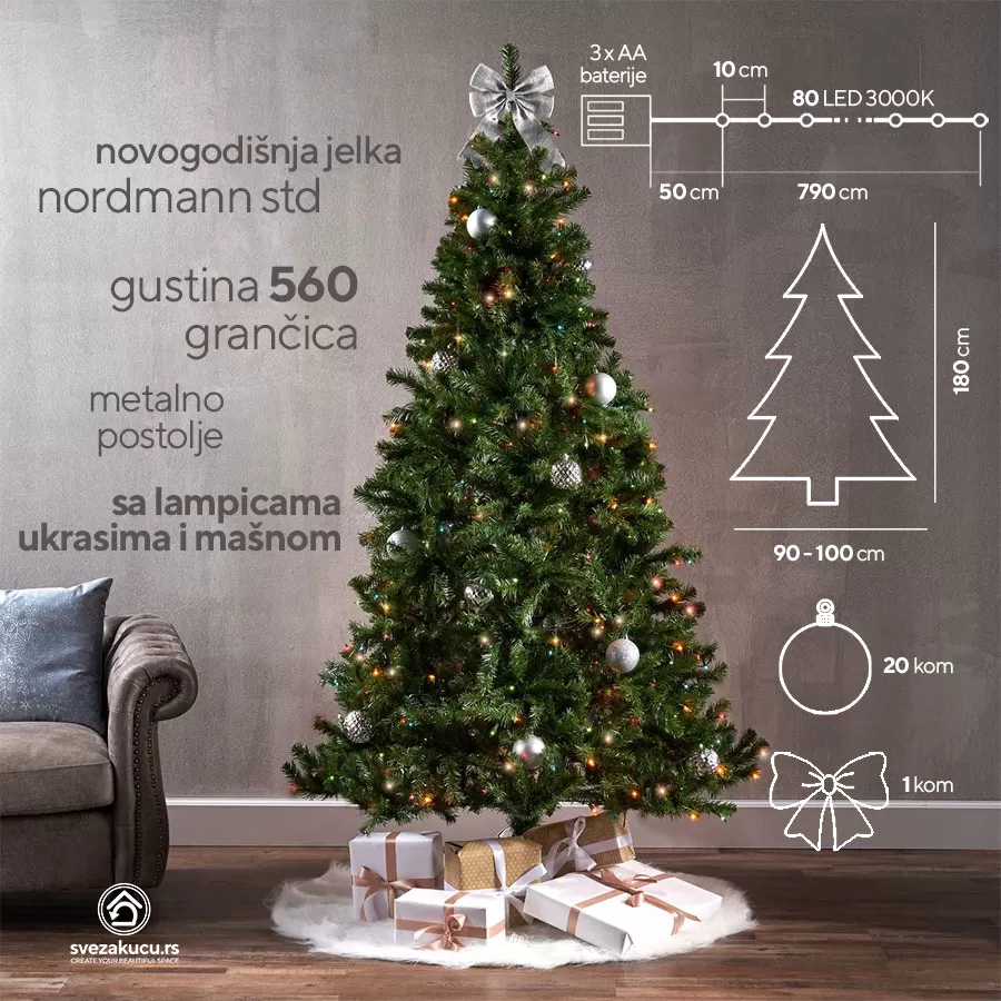 Gusta novogodišnja jelka 180cm Nordmann std sa lampicama, ukrasima i mašnom