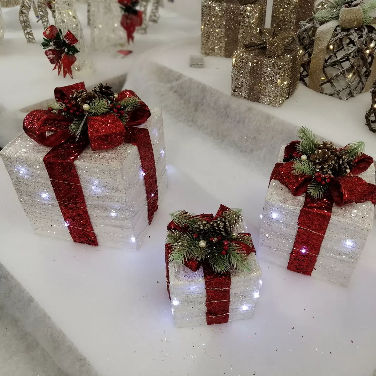 Bele Dekorativne LED Svetleće Poklon Kutije Sa Crvenom Trakom - 3 Komada - Glossy 30