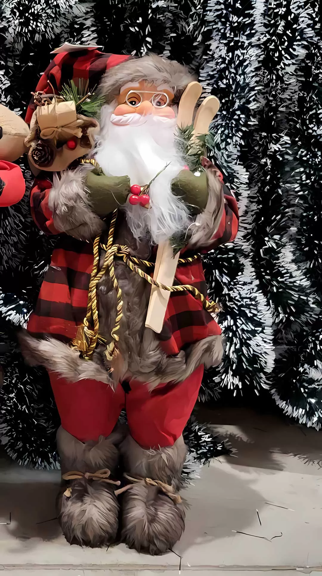 Figura Deda Mraza sa poklonima, skijama i grančicama