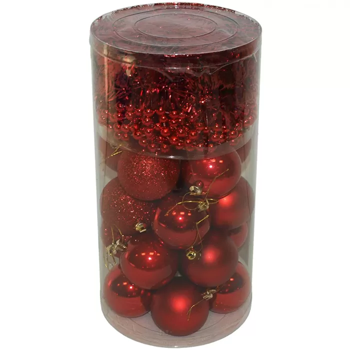 Komplet ukrasa za jelku u crvenoj boji: kuglice, girlanda, perlice
