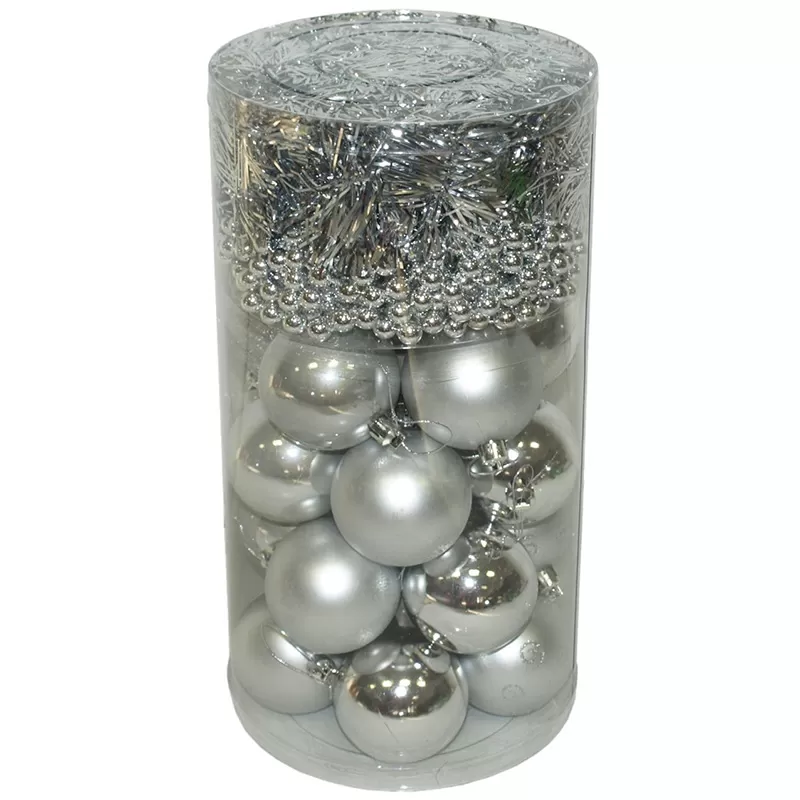 Komplet ukrasa za jelku u srebrnoj boji: kuglice, girlanda, perlice