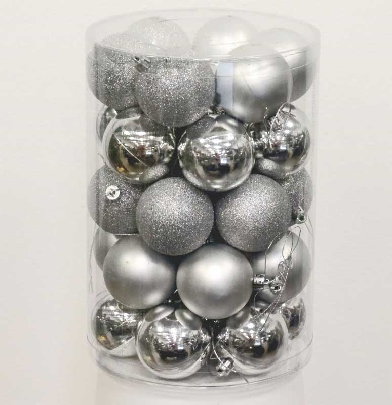 Novogodišnji ukrasi za jelku. Komplet sadrži 34 kugle prečnika 6cm, srebrne boje (14 sjajnih, 10 mat i 10 gliter).