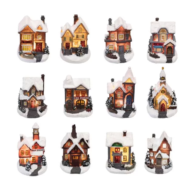 12 zimskih kućica sa LED svetlom koje radi na baterije, te ih možete postaviti na koje god mesto želite. Sve kućice su različite. Namenjene su za unutrašnju upotrebu.