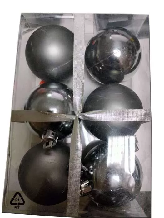 Novogodišnje kugle za jelku, sive boje. Prečnik kugle je 6 cm. U pakovanju se nalazi 6 kugli.