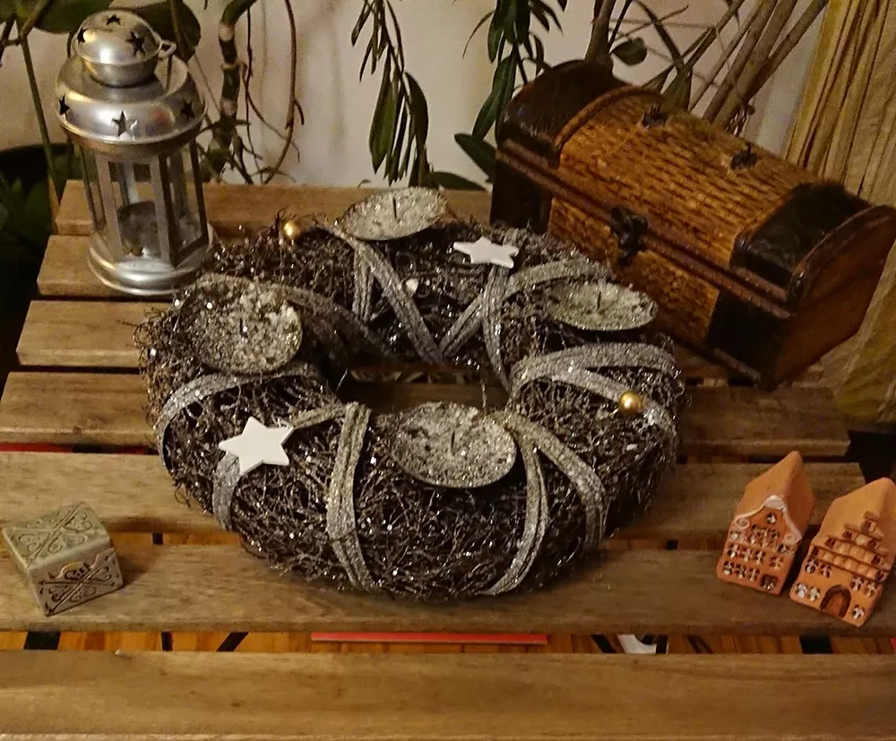 Novogodišnji venac sa 4 svećnjaka. Prečnik venca je 30 cm, kvalitetne i bogate izrade koja u potpunosti dočarava zimsku idilu u vreme novogodišnjih i božićnih praznika. Svećnjaci su namenjeni za mini sveće...