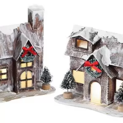 Dve lepe svetleće kućice dekorisane u prazničnom stilu, sa unutrašnjim osvetljenjem koje radi na baterije.