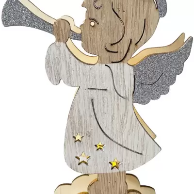 Drveni ukras u obliku anđela, dimenzija: 9.5 x 2.5 x 15 cm, sa toplo žutim svetlom. 5 LED lampica.