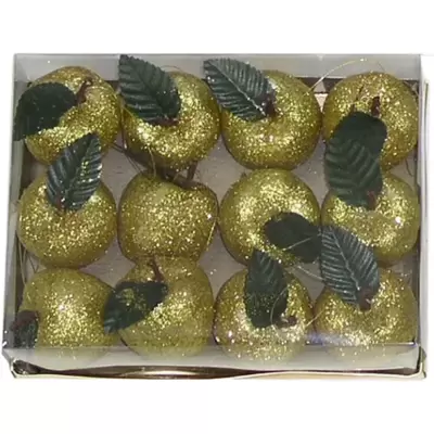 Pakovanje 12 ukrasa u obliku jabuka u zlatnoj boji. Veličina ukrasa: 4 cm.