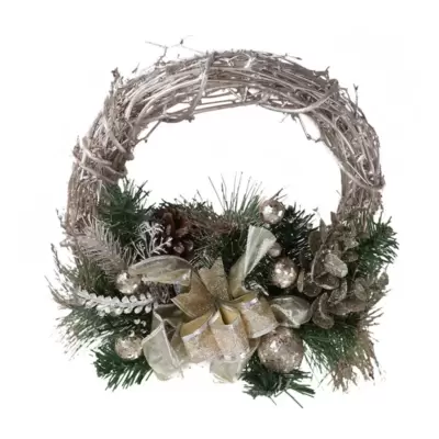 Girlanda sa svetlima i ukrasima, u obliku kruga prečnika 29 cm. 10 mini LED lampica, belo svetlo. Metalna konstrukcija. Radi na baterije 3 x AA.
