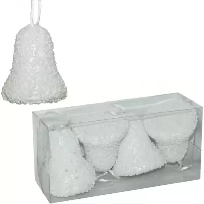 Božićna dekoracija u obliku zvona, bele boje, visine 7 cm. U pakovanju je 4 komada.