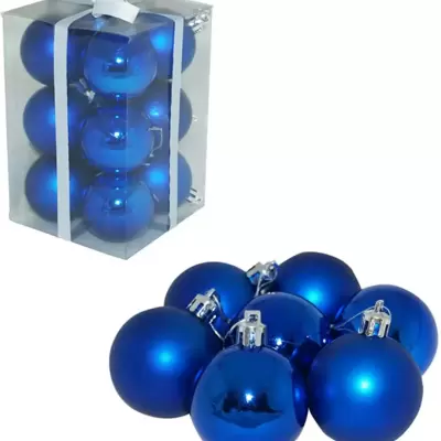 Plave kuglice prečnika 6 cm, izrađene od kvalitetne plastike. U pakovanju se nalazi 12 komada, 6 sjajnih i 6 mat.