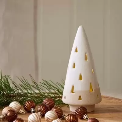 Novogodišnja porcelanska jelkica visine 21cm, sa ugrađenom LED diodom koja osvetljava prostor kroz otvore na površini jelke. Dizajn u beloj boji sa...