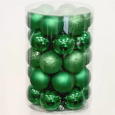 Novogodišnji ukrasi za jelku. Komplet sadrži 34 kugle prečnika 6cm, zelene boje (14 sjajnih, 10 mat i 10 gliter).