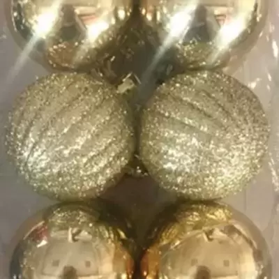 Kuglice prečnika 8 cm, zlatne boje sa dekoracijom, izrađene od kvalitetne plastike. U pakovanju dolazi 6 komada.