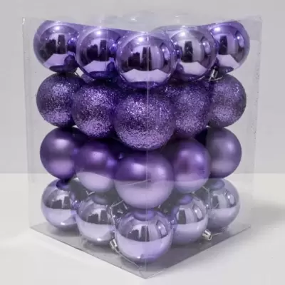36 novogodišnjih ukrasa za jelku u obliku kugle ljubičaste boje. U setu se nalazi 18 sjajnih, 9 mat i 9 gliter ukrasa.