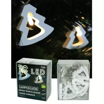 10 LED lampica u obliku jelke (5.8 x 5.2 cm), na prozirnoj žici. Toplo belo stalno svetlo. Dužina niza 190 cm. Razmak između lampica 20 cm. Radi na...