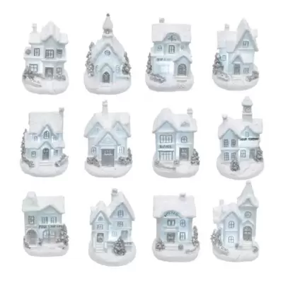 12 belih zimskih kućica sa LED svetlom koje radi na baterije, te ih možete postaviti na koje god mesto želite. Sve kućice su različite.