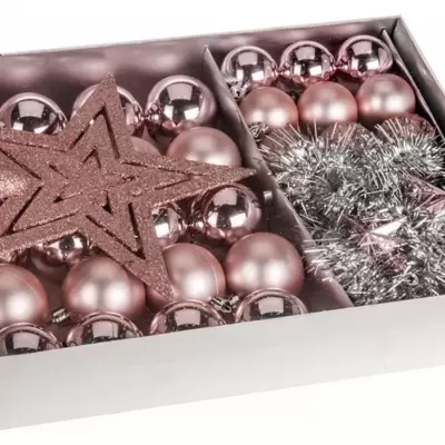 Osnovni paket ukrasa za ukrašavanje jelke. Čine ga kugle, girlande i vrh za jelku. U kompletu dobijate 33 ukrasa pink boje...