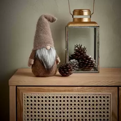 Novogodišnji vilenjak u neutralnim bež i braon bojama. Sa pahuljastom kapom i punom bradom koja unosi razigran izgled u vaš praznični dekor....