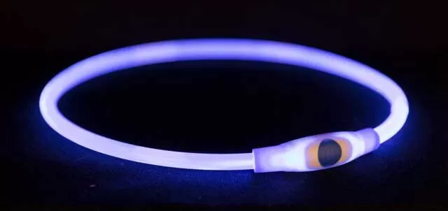 Svetleća ogrlica za pse obezbeđuje sigurnost za Vašeg ljubimca u uslovima smanjene vidljivosti ili po mraku. Možete je podesiti da treperi ili neprestano svetli. Punjiva, kabl u paketu.