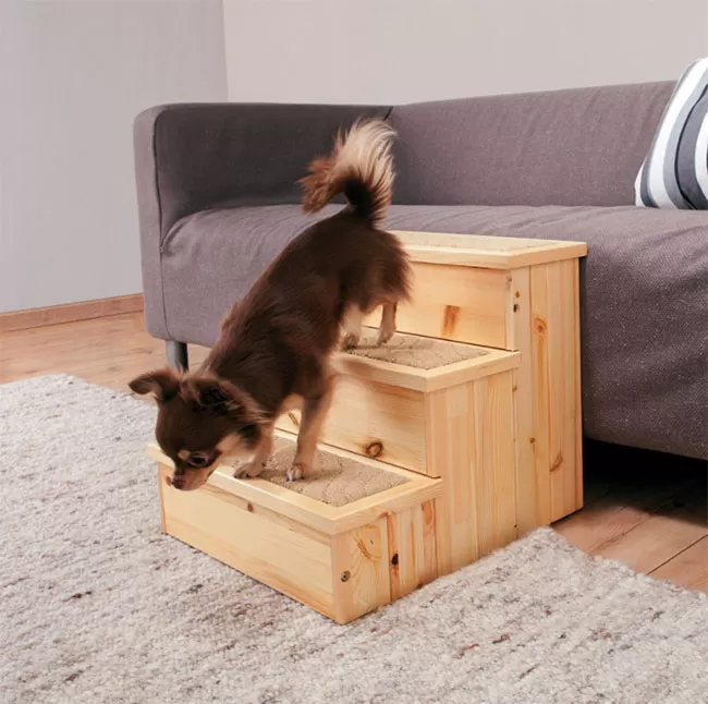 Ako ja Vaš ljubimac neke rase koja je sklona oboljenjima zglobova ili već ima takvih problema, rešenje su stepenice koje će mu omogućiti da dosegne neko mesto bez skakanja. Drvene, dimenzije 40x38x45.