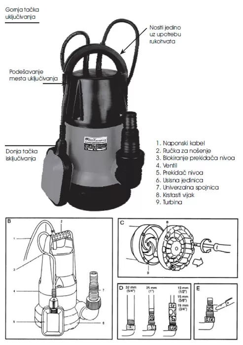 Pumpa je namenjena za prljavu vodu. Ne koristiti za navodnjavanje i kućne instalacije.