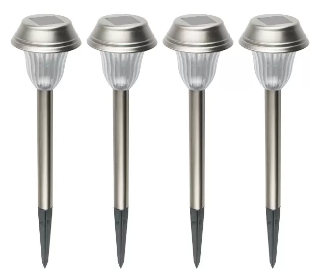 Komplet 4 solarne lampe sa solarnom ćelijom i izmenljivom punjivom baterijom AAA 1.2V/200mAh. Postavlja se ubadanjem u zemlju i otporna je na vremenske uticaje