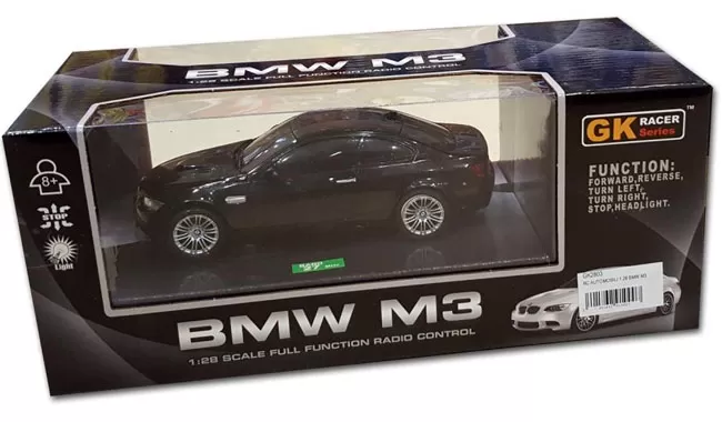 Model super automobila BMW M3, sa daljinskim upravljanjem. Može da se kreće napred, nazad, levo i desno, a pale mu se i svetla napred. Model je izrađen u razmeri 1:28.