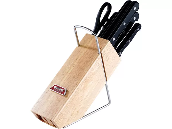 Materijal: Noževi - nerđajući čelik, guma; stalak: drvo, aluminijum