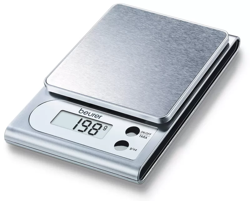Beurer kuhinjska vaga KS22. Ravna površina od nerđajućeg čelika. Merenje od 1g/3kg.