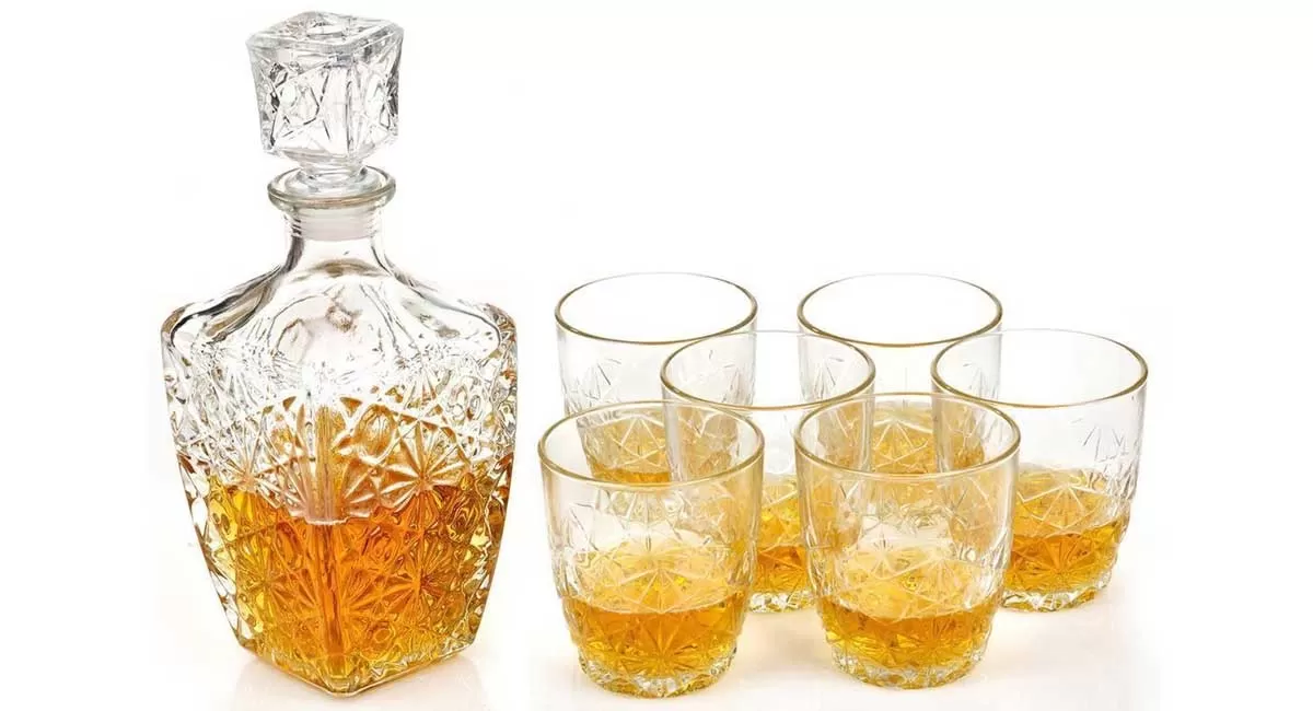 Set od 7 delova (flaša + 6 čaša) Dedalo sadrži prozirnu staklenu flašu i staklene čaše starinskog izgleda sa svetlucavim zvezdastim uzorkom. Dekorativna flaša ima kapacitet od 780 ml i prepoznatljiv kristalni dizajn inspirisan lomljenim ledom; čaše imaju