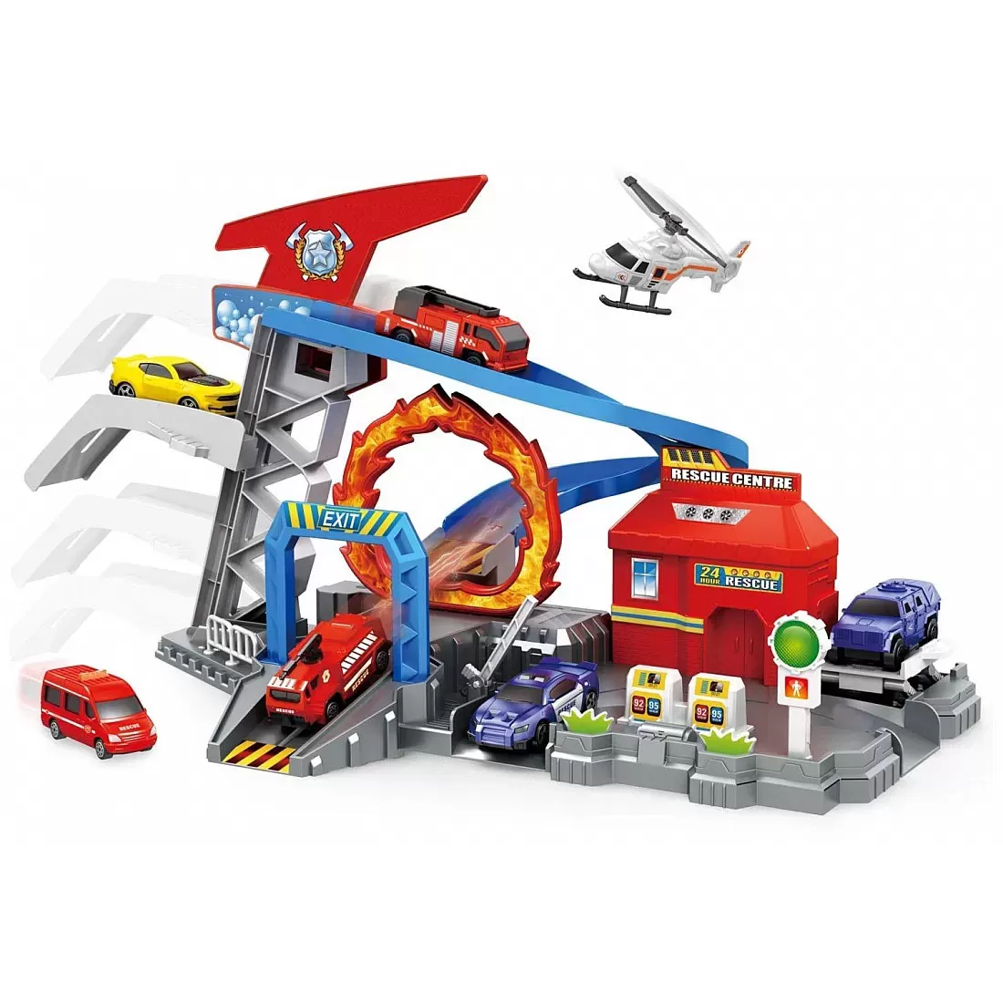 Spasilački centar sa vozilima. U pakovanju se nalaze 4 spasilačka vozila. Parking sadrži mnoštvo zanimljivih detalja među kojima su lift, tobogan, pumpa...