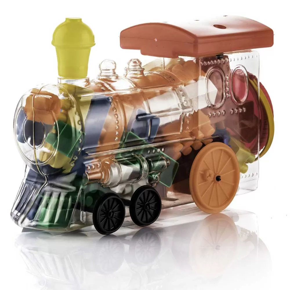 Transparentna lokomotiva sa raznobojnim gradivnim kockama različitih veličina