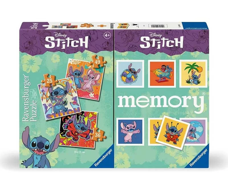 Komplet igara za decu Disney Stitch se sastoji od 3 jednostavne slagalice (25, 36 i 49 delova) i društvene igre memorije (2x24 karte), prilagođene po dimenziji i broju delova uzrastu od 4 godine i više.
