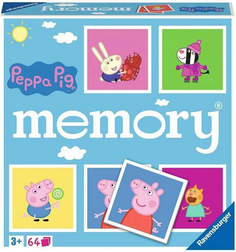 Memorija Peppa Pig je društvena igra sa jednostavnim principom koja kod dece razvija zapažanje, pamćenje i koncentraciju. Pakovanje sadrži 2x32 kartice sa slikama iz omiljenog crtaća. Uzrast: 3-99.