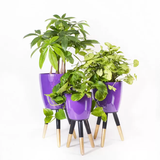 Drveni stalak zlatno-crni sa ljubičastom saksijom 20 cm