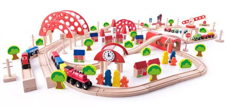 Velika pruga koja ima i most i tunel i centralnu stanicu i tri voza (teretni i dva putnička) i sve što treba da se dočara ambijent: kuće, drveće, ljude, automobile... Uživanje u igri! Uzrast: 3+.