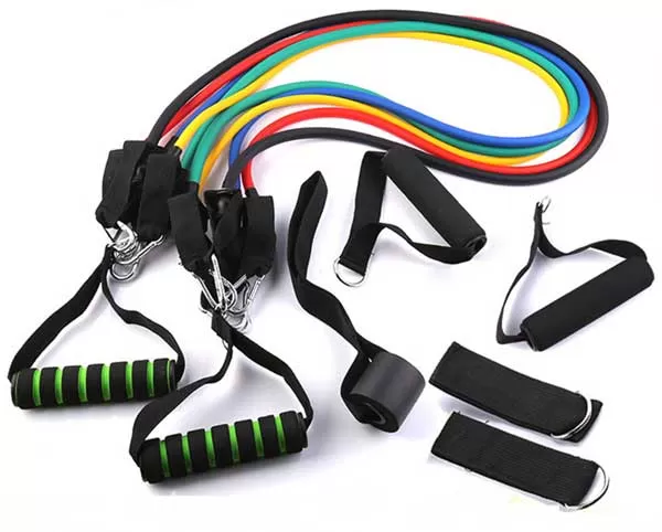 set sadrži 11 delova: 5 guma različite rastegljivosti (jačine), 2 seta ručki koji se lako kače na odgovarajuću gumu, 2 gurtne za noge i platnenu kesu za nosenje