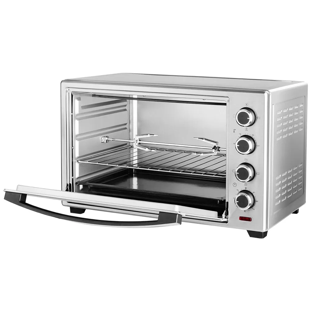 Električni šporet poseduje precizno podešavanje temperature rerne od 100 do 230 °C, zapreminu 48 l, gril s okretanjem i duplo staklo.