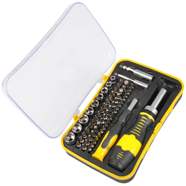 Pakovanje: 20x bitova od 4mm, 31x bitova od 6mm, 2x produžetak 60mm, 1x 4mm šrafciger sa rotirajućom drškom, 9x nasadnih ključeva