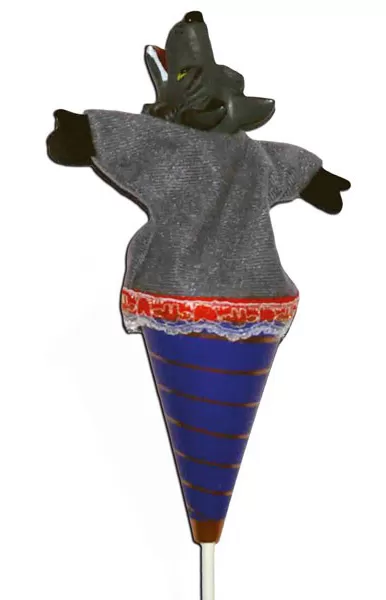 Ginjol lutka, sa likom vuka, na štapu. Glava lutke je izrađena od kvalitetne gume, a telo čine kombinacija tekstila i plastike.