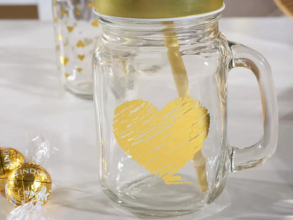 Otporna staklena čaša sa slamkom i ornamentima u zlatnoj boji idealna je za ceđeni sok ili smooti Metalni poklopac daje sigurnost od prosipanja tečnosti