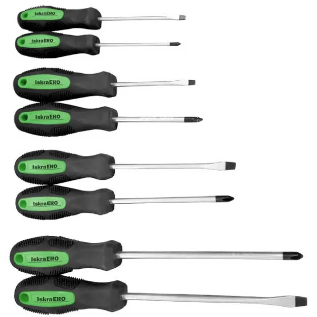 Set odvijača sa namagnetisanim vrhovima. Garnitura sadrži po četiri odvijača sa pljosnatim i Philips vrhom.