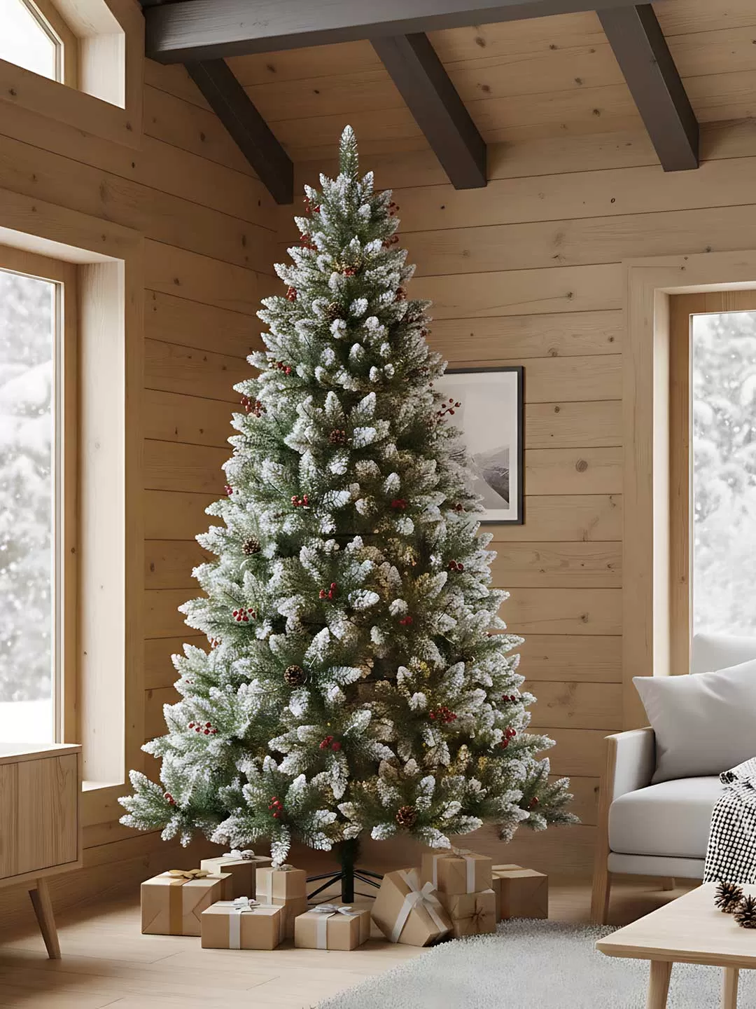 Jelka visine 240 cm sa Šišarkama, Bobicama i Snegom