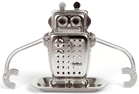 Stalni filter za čaj od nerđajućeg čelika, u obliku robota, odgovara svim šoljama jer ima prilagodljive ruke kojima se zgodno zakači za rub.