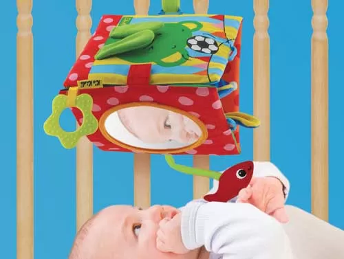 Igračka se može složiti u oblik trougaone prizme i služiti za igru kad je beba na stomaku