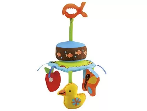 Tri igračkice (patkica, leptirić, jabuka) se vrte u ritmu nežne melodije
