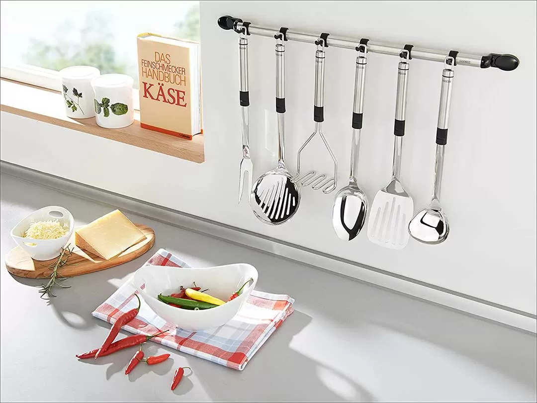 Odložite kuhinjski pribor na praktičan i elegantan način. Leifheit kuhinjski nosač od nerđajućeg čelika dolazi sa 9 kuka za kačenje kutlača, spatula, mikser metlica i ostalog, nezaobilaznog, kuhinjskog alata. Kombinacija crne plastike i nerđajućeg čelika.