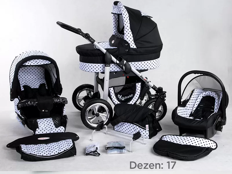 3u1 uključuje: Ram, kolevka, sportski deo, auto sedište, zimske navlake posebno za svaki deo, mamina torba, mreža protiv insekta, zaštita za kišu