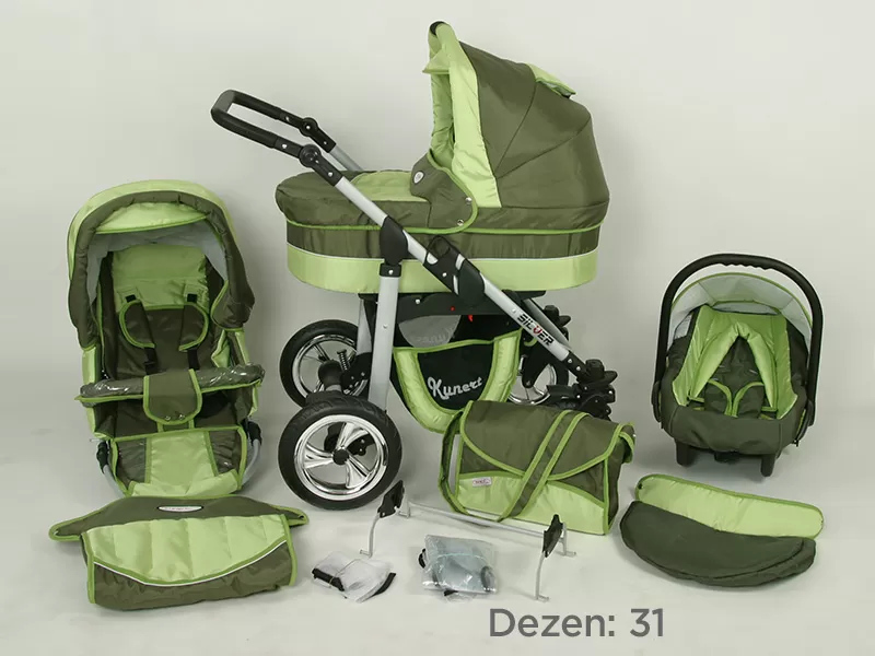 3u1 uključuje: Ram, kolevka, sportski deo, auto sedište, zimske navlake posebno za svaki deo, mamina torba, mreža protiv insekta, zaštita za kišu
